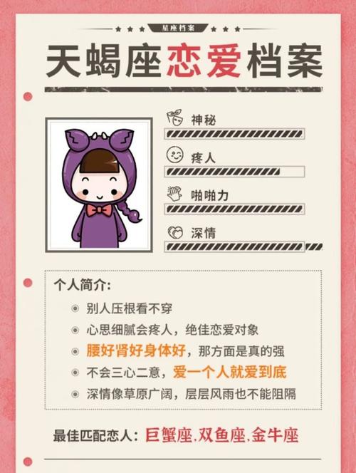 对天蝎座来说,他们精力充沛,占有欲强,思想沉重,天生就有一种神秘的气息,在别人和他们相处时会感到沮丧,但总有例外,从占星术的角度来看,天蝎座与癌症、双鱼座、摩羯座、处女座比其他星座要好。